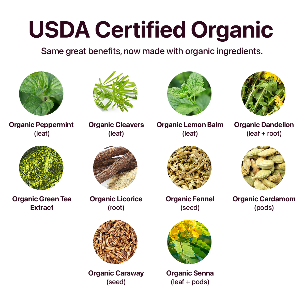 | Organic Senna (leaf and pods), Organic Peppermint (leaf), Organic Licorice (root), Organic Caraway (seed), Organic Dandelion (root). |
